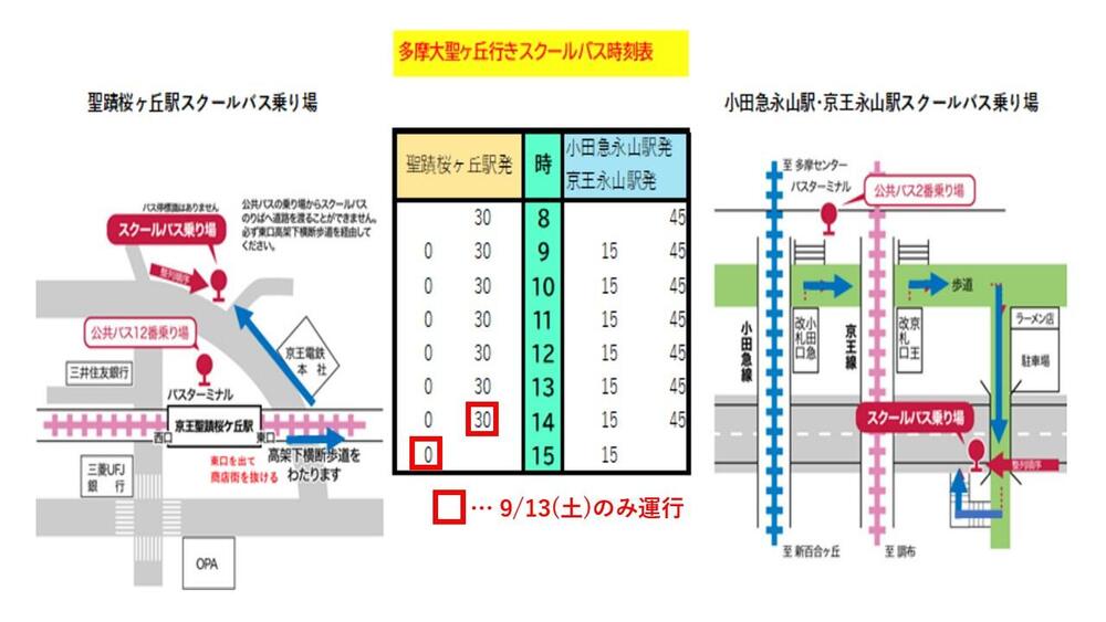 下のスクールバス乗り場案内・時刻表をご参考ください。また、企画一覧は9月上旬にお知らせします。