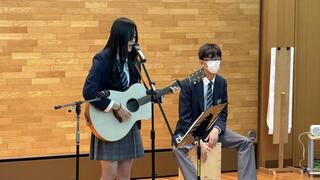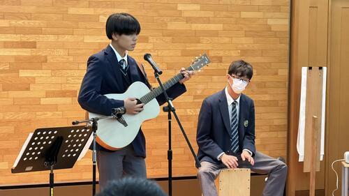 2025年11月5日 クラブ活動 軽音楽部の地域貢献! 今年度創部された軽音楽部が、11月2日に初めての学外公演を行いました。 今回は「多摩市・聖ヶ丘への地域貢献!」ということで、聖ヶ丘のコミュニティー施設である「ひじり館」の「ひじり館まつり」にアコースティック編成で参加しました。 中間考査後のタイトなスケジュールでしたが可能な限りの準備を行い、自分たちの演奏も会全体のMCも堂々と行うことができ、地域の方々も温かい声援をいただきました。 今後も学内外での公演活動を行いつつ、地域を盛り上げるイベントにも参加していきたいです!
