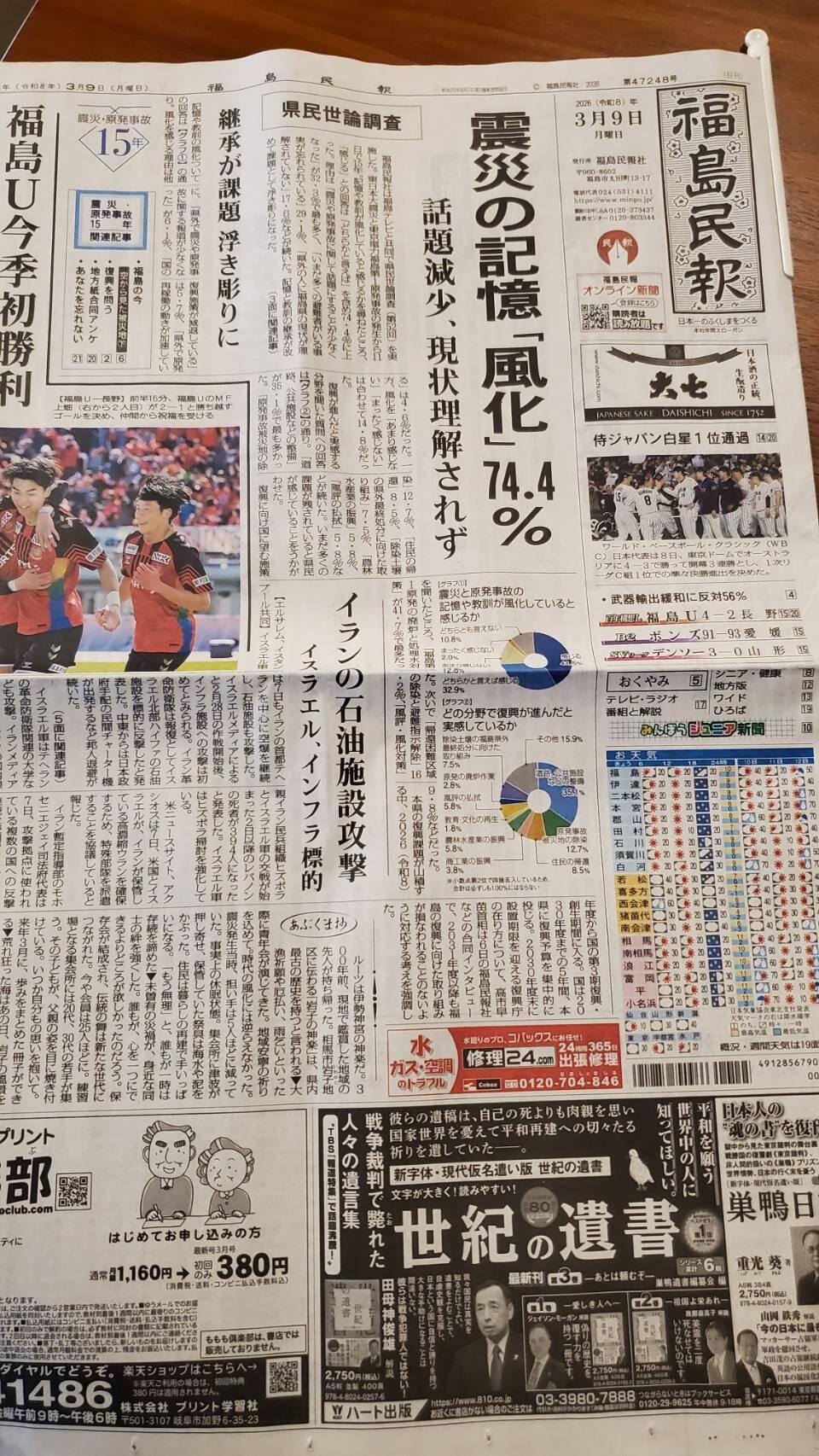 3月9日福島民報朝刊。震災についての記事は、東京とは桁違いに詳しいです。