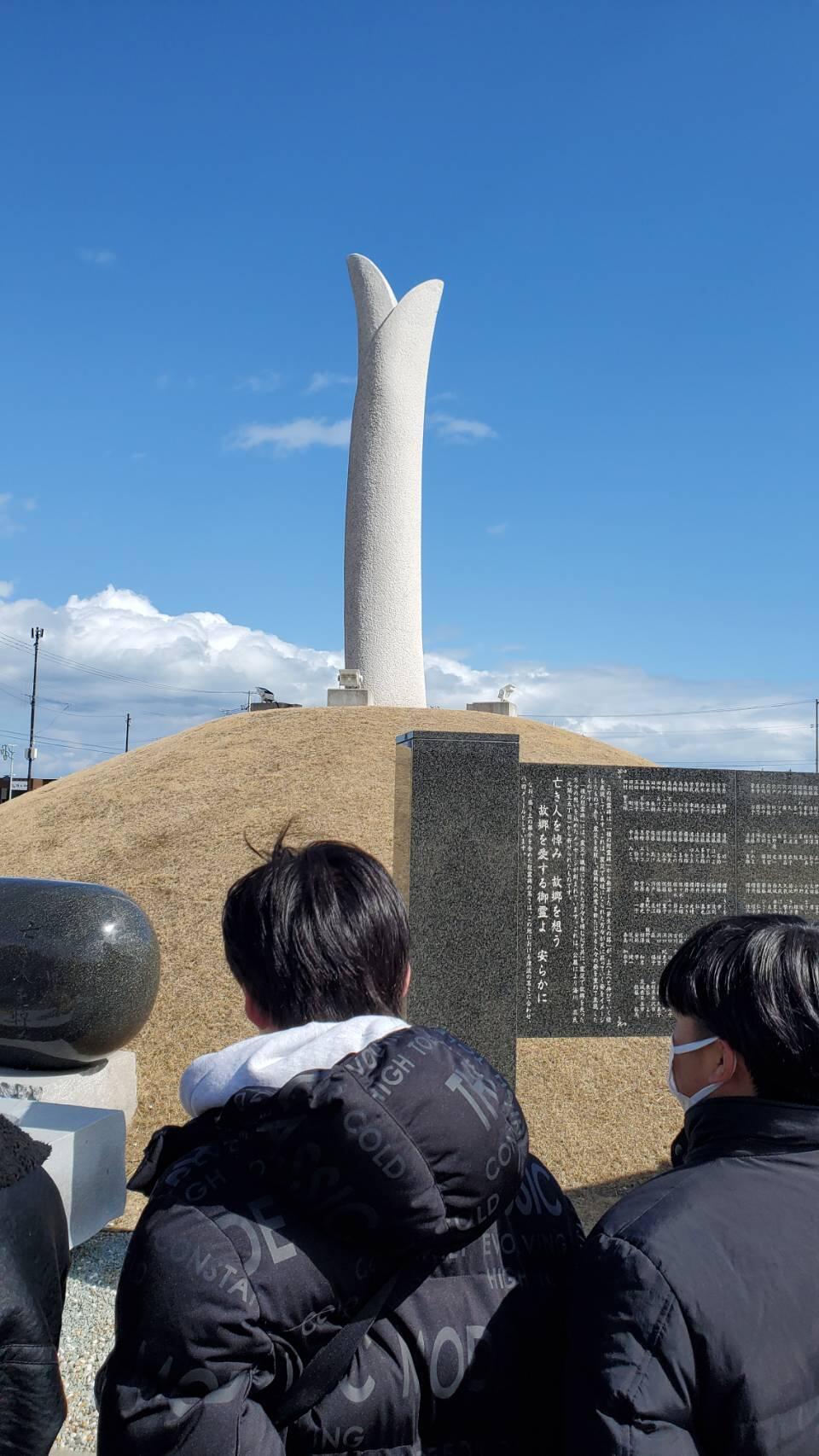 芽生えの塔。津波の高さと同じ8.4メートル。