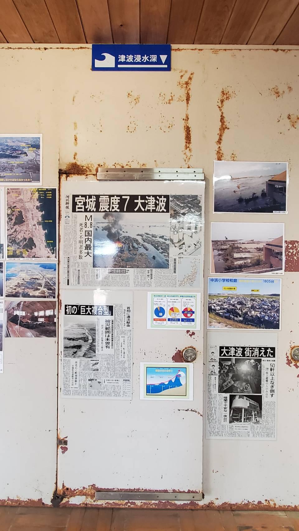 当時の図書室の展示。青いプレートのところまで津波が来たそうです。