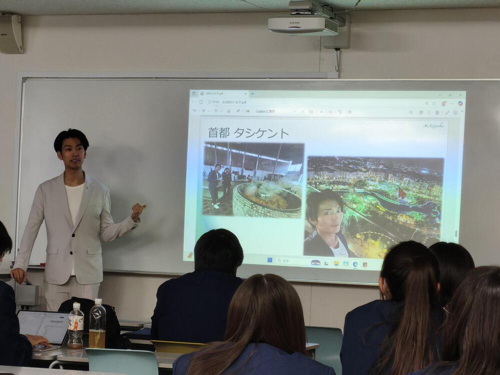 2025年11月12日 探究/A知探Q ウズベキスタン説明会 スタディーツアーで来年3月にウズベキスタンに行く生徒23名を対象に講習会を行っております。11月1日には、俳優として活躍し、ウズベキスタン観光大使でもある、南 圭介さんにお越しいただきました。ウズベキスタンのお土産品なども使いながら、引き込まれるようなお話をしていただき、生徒は強い関心をもったようでした。