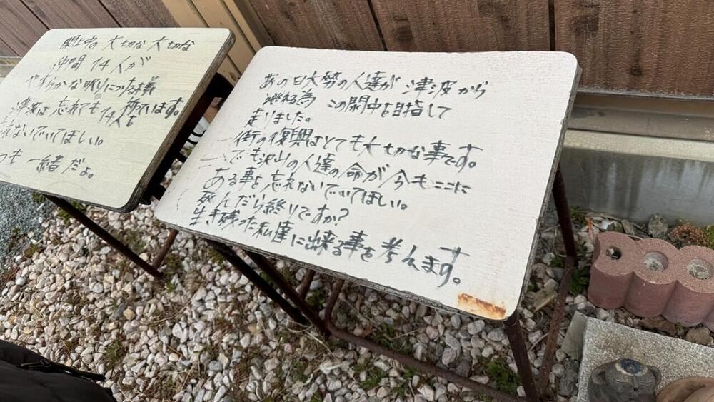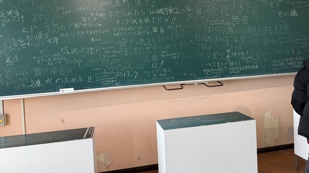 請戸小学校の教室の黒板。被災者の方のメッセージもありました。