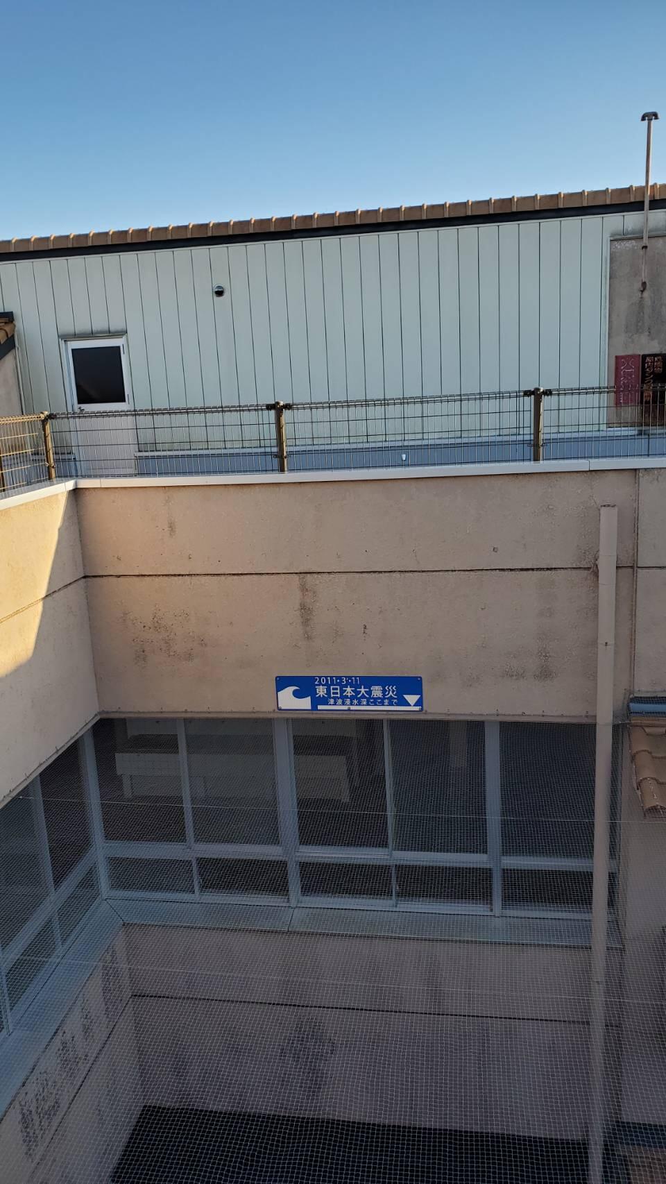 子供たちが避難した屋上から見える青いプレート。津波がここまで来たそうです。