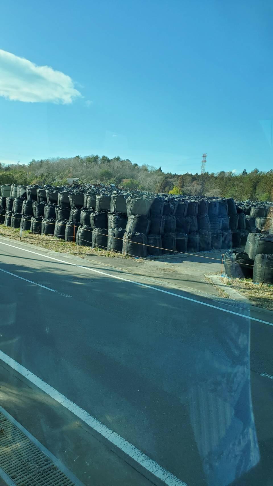 除染作業で出た放射性廃棄物を詰めた黒い袋、フレコンバッグ。14万個があちこちに並んでいました。